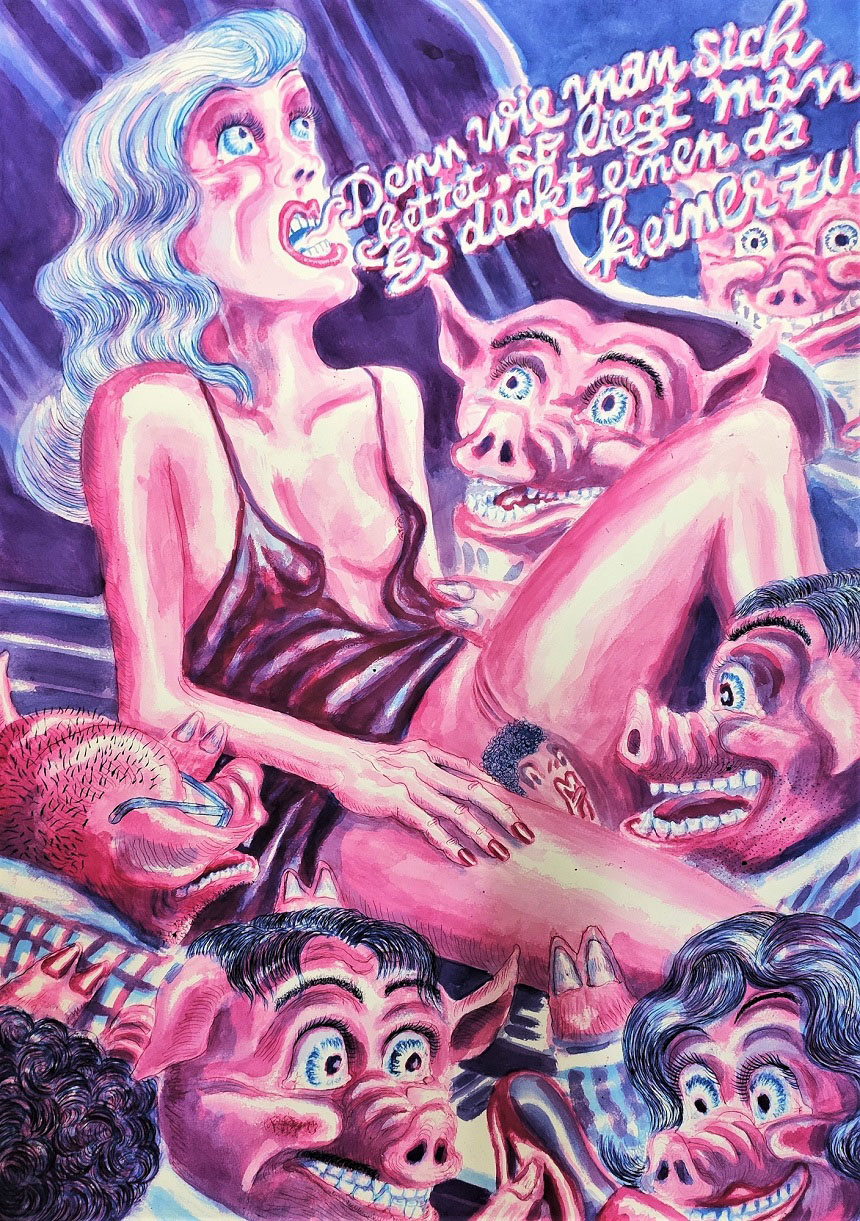 Selon sa très officielle biographie, le mystérieux Martes Bathori serait né au siècle dernier dans la région des Carpathes Transylvaniennes. Après un long compagnonnage au sein des écoles d’art les plus prestigieuses d’Europe centrale, ce plasticien, dessinateur, céramiste au talent protéiforme s’installe à Paris. Il s’impose sur la scène graphique contemporaine en 2004 avec la publication de "Monsieur Q à Djakarstadt", sa première bande dessinée aux éditions du Seuil et l’exposition "Un Monstre a avalé nos affaires de toilettes" - en duo avec Pierre La Police - déjà produite par la galerie Arts Factory. Publiés simultanément par les éditions ION et The Hoochie Coochie, "Utopia Forever" et "Lola Reine des Porcs" sont les nouveaux chapitres de sa grande épopée dystopico-porcine, dont les principaux récits ont été publiés de 2009 à 2017 par Les Requins Marteaux.